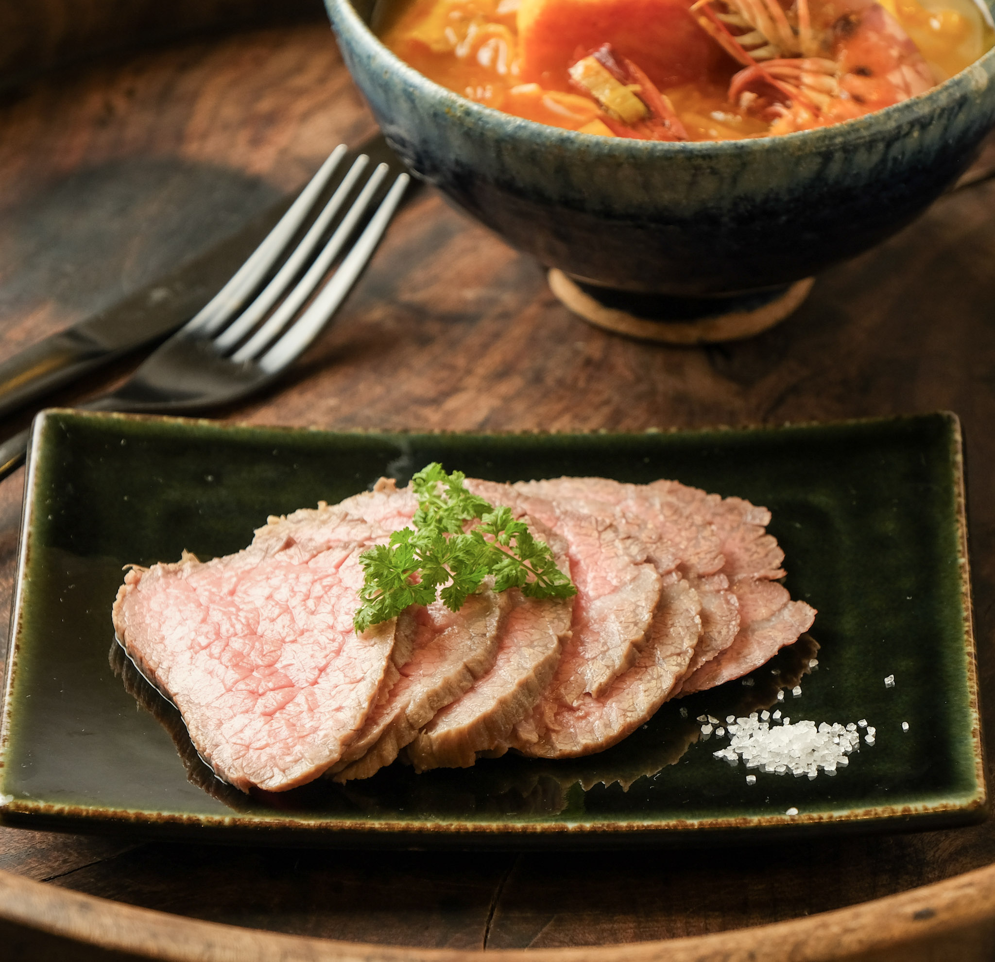 ●ローストビーフ(とってもジューシーに、中はミディアムレアに焼き上げる定番料理)