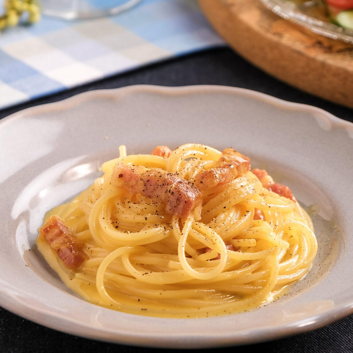 ●本場イタリアの生クリームを使わないカルボナーラ(ペコリーノチーズという山羊のチーズを使用して作る本場スタイル)